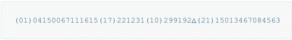 Die Kodierung folgt der GS1 Kennzeichnung, zu erkennen durch die abgetrennten Attribute (01), (10), (17) und (21):