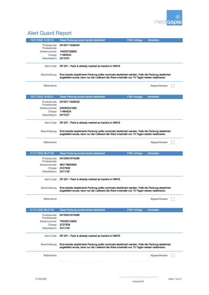 Natürlich können Fälschungen nie ausgeschlossen werden. Auch in diesem äußerst unwahrscheinlichen Fall ist auf medAspis 100% Verlass. Wir stehen mit einem eigenen Alert Guard-Team an Ihrer Seite. Als Experten unterstützen wir bei Behandlung und Dokumentation aller Fälle.